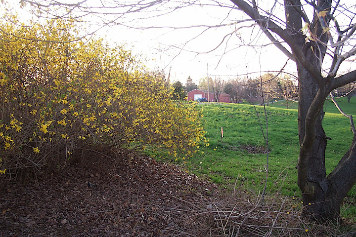 Here are two flowering shrubs in the yard. The yellow one is Forsythia (I think) and I don't know what the pink flowers are.